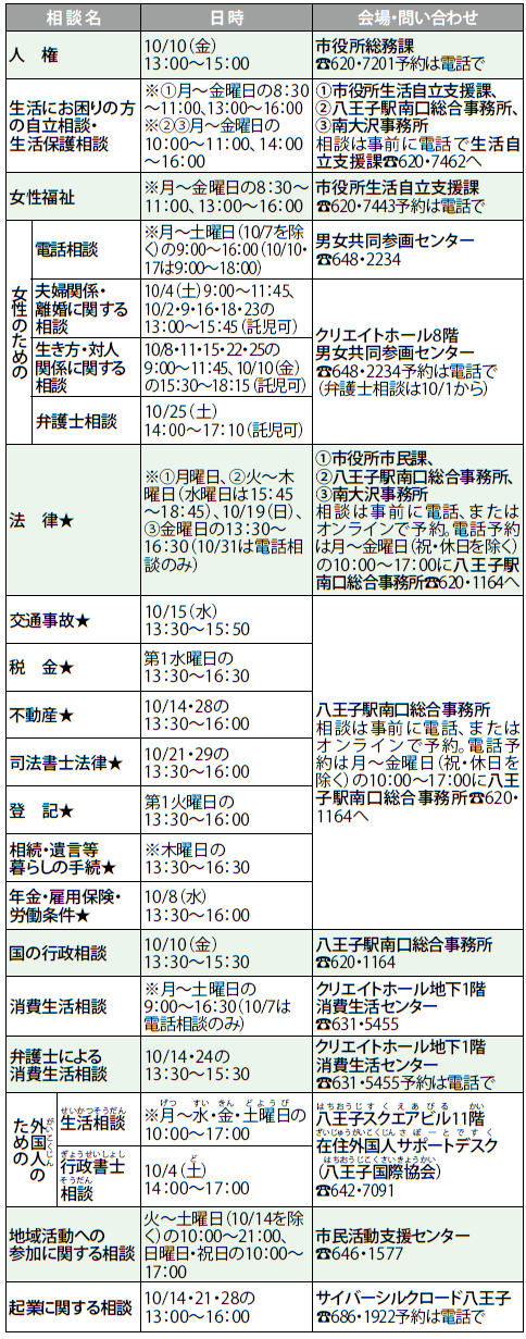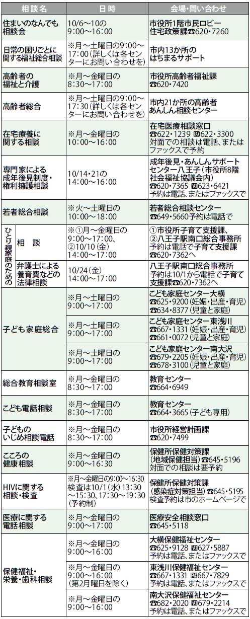 くらし 10月 相談まどぐち 35/41 前の記事 次の記事 発行日 : 2025年10月01日 自治体名 : 東京都八王子市 広報紙名 : 広報はちおうじ 令和7年10月1日号 ※印は祝・休日を除きます。定員がある相談もあります。 ★印は右の二次元コードからオンライン予約ができます。 Tweet シェアする 情報ファイル/その他 世帯と人口(令和7年8月末日現在)