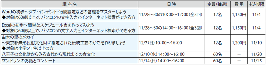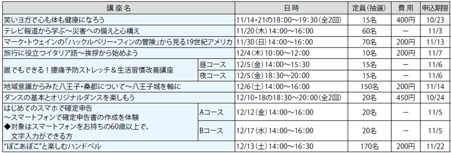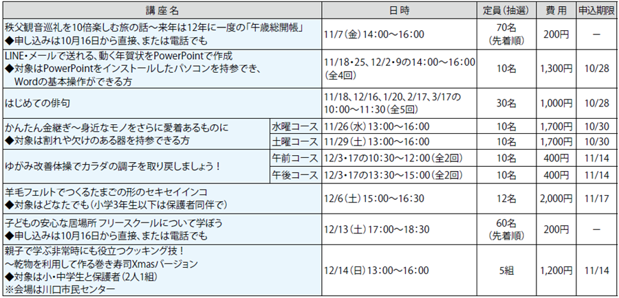 申し込み:往復ハガキ、またはメールに講座名(1講座1通1名のみ有効。コースが複数ある講座は希望コースも)と住所・氏名(ふりがな)・年齢・電話番号、市内在勤・在学の方はその旨、往復ハガキは返信面の宛名を書いて、申込期限(必着)までに各センターへ