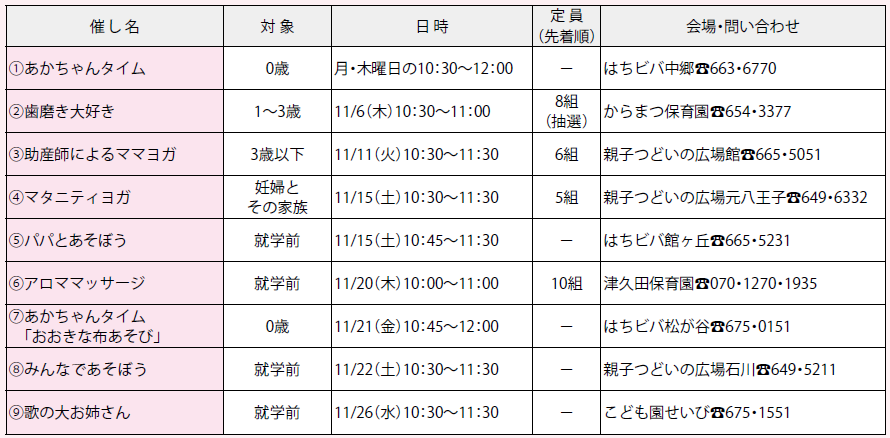 おもに3歳までのお子さんと保護者が一緒に遊べて、相談ができる子育てひろば。子育てに役立つ講座やイベントを下表のほかにも各施設で開催しています。詳しくは子育て応援サイトをご覧ください。