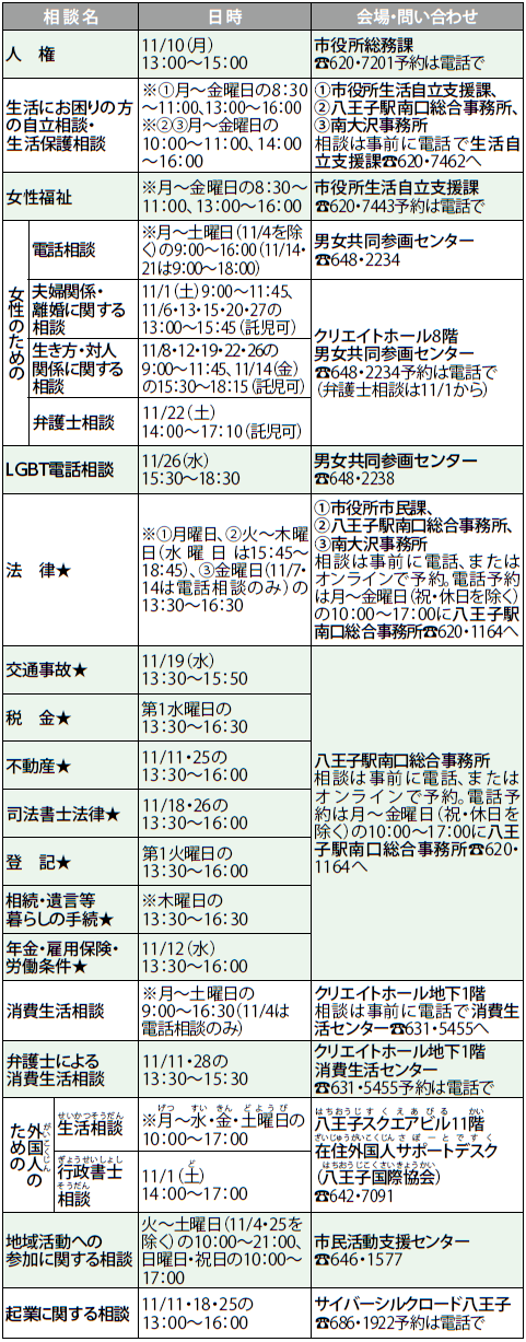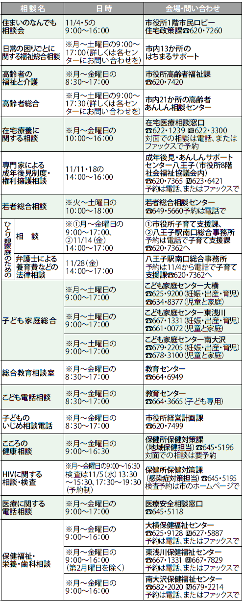 くらし 11月 相談まどぐち 34/38 前の記事 次の記事 発行日 : 2025年11月01日 自治体名 : 東京都八王子市 広報紙名 : 広報はちおうじ 令和7年11月1日号 ※印は祝・休日を除きます。定員がある相談もあります。 ★印は右の二次元コード(本紙参照)からオンライン予約ができます。 Tweet シェアする 情報ファイル/その他 世帯と人口(令和7年9月末日現在)