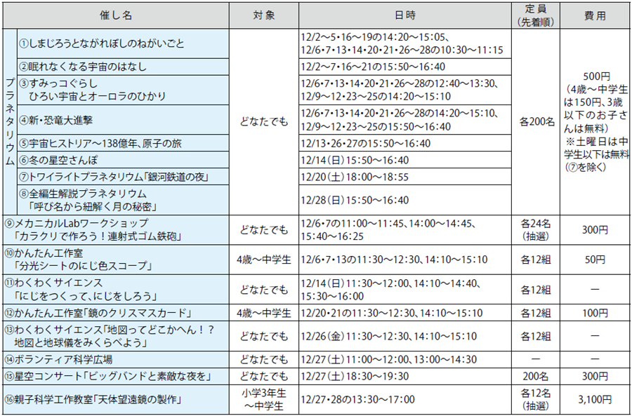 申し込み:(9)(16)開催日の10日前までに、(15)12月20日から市のホームページで