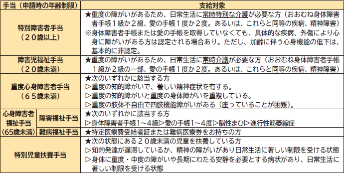※子育て世帯向けに、障がいの程度によって受給可能な手当があります。詳細はこども育成課手当・医療係へお問い合わせください。