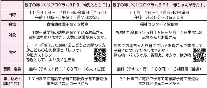 子育て 親子の絆づくりプログラム BP3「幼児とともに!」・BP1「赤ちゃんがきた!」 42/86 前の記事 次の記事 発行日 : 2025年10月01日 自治体名 : 東京都青梅市 広報紙名 : 広報おうめ 令和7年10月1日号 Tweet シェアする 小児インフルエンザ予防接種任意接種 接種費用の一部助成 10月1日から BCG予防接種は市内協力医療機関へ