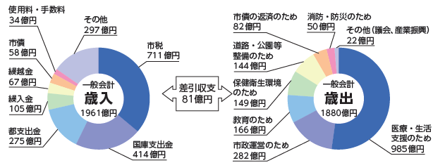 歳出総額は、前年度より83億円増加しました。これは、保健衛生環境のための支出が46億円減少したものの、市政運営のための支出が41億円、医療・生活支援のための支出が37億円増加したことなどによります。