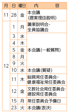 本会議・委員会を下表のとおり開催します。開会時間は午前10時です。ただし、11月28日(金)は午後1時です。