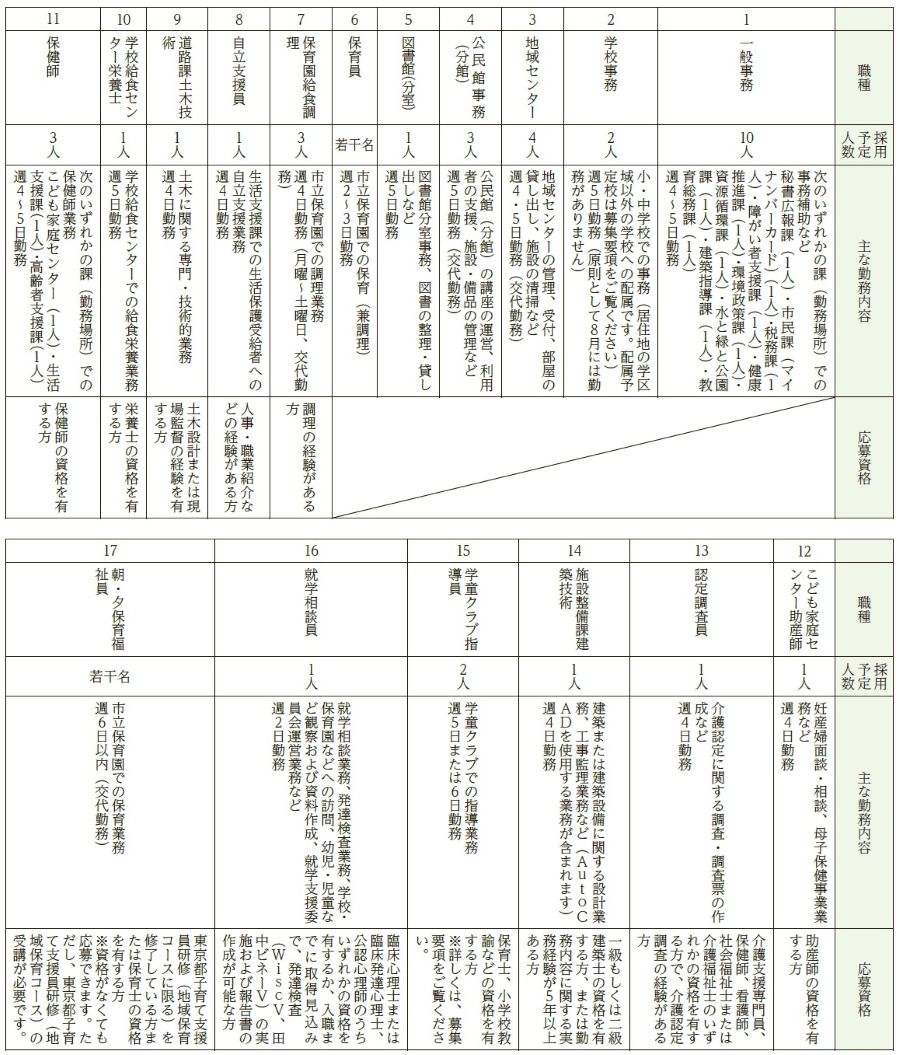 提出書類:採用申込書(縦4センチメートル×横3センチメートルの写真を貼ったもの)、受験票、返信用封筒(本人の宛先を記載し、百10円切手を貼ったもの)、左表10〜17の職種は、資格を証明する書類の写し