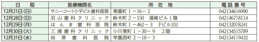 くらし 休日歯科応急診療医 12/48 前の記事 次の記事 発行日 : 2025年12月20日 自治体名 : 東京都小平市 広報紙名 : 市報こだいら 令和7年12月20日号 診療時間:午前9時~午後5時 ※受診の際は、事前にお問い合わせください。また、医療機関は変更になる場合があります。 Tweet シェアする 休日応急診療・準夜応急診療(内科・小児科) 救急診療などの相談・案内