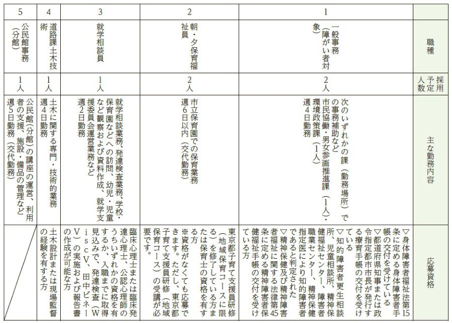 職種・採用予定人数などは、左表のとおりです。勤務時間など、詳しくは募集要項をご覧ください。