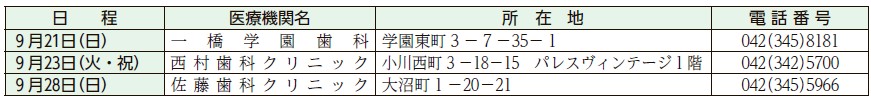 くらし 休日歯科応急診療医 20/53 前の記事 次の記事 発行日 : 2025年09月20日 自治体名 : 東京都小平市 広報紙名 : 市報こだいら 令和7年9月20日号 診療時間:午前9時~午後5時 ※受診の際は、事前にお問い合わせください。また、医療機関は変更になる場合があります。 Tweet シェアする 休日応急診療・準夜応急診療(内科・小児科) 救急診療などの相談・案内