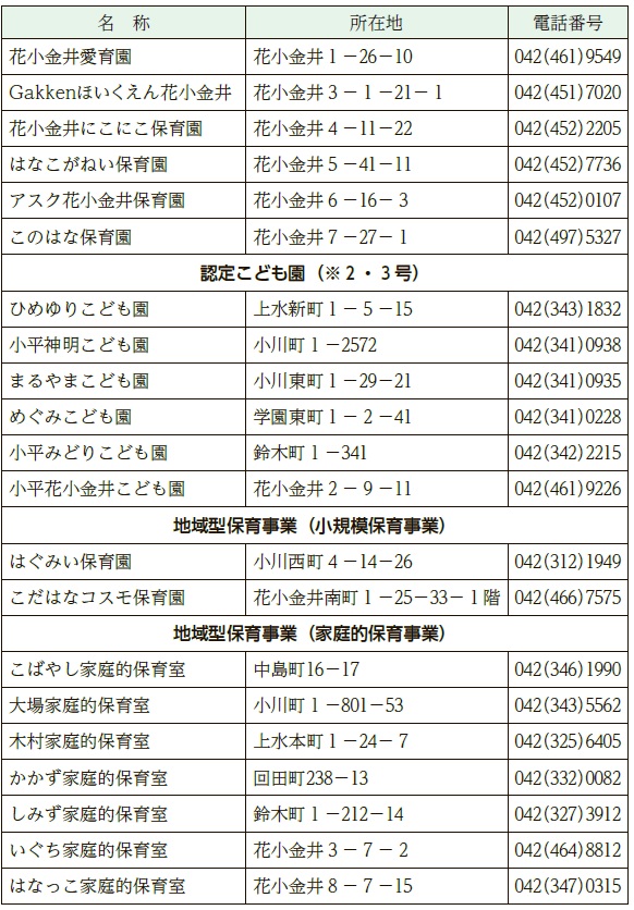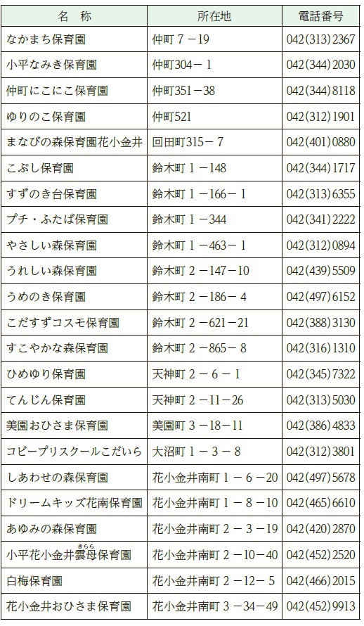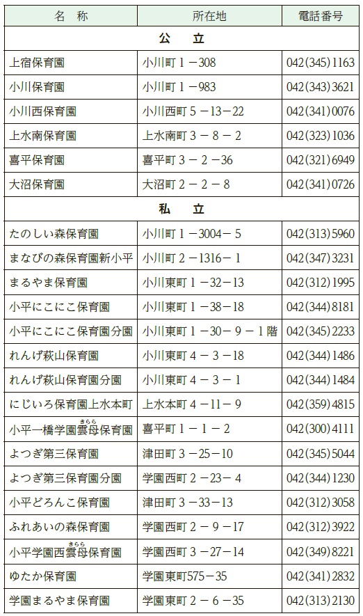 入園のしおりや入園申込書などは、10月1日(水)から問合せ先(市役所2階)、東部・西部出張所、動く市役所、市内の公立・私立保育園、小規模保育事業施設で配付するほか、小平市ホームページ(入園・転園申込み…ID107617、申込関係様式…ID057661)からダウンロードもできます。