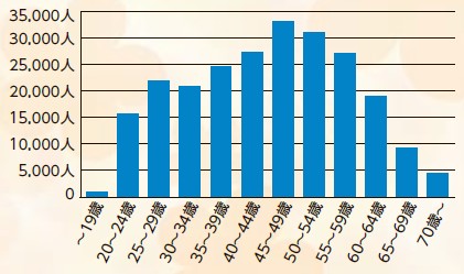 社会保険・社会福祉・介護事業では、40代が最も多く、さまざまな年代の方が協力し合って仕事をしています。
