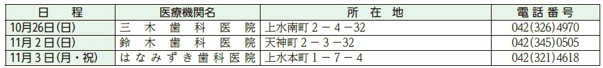 くらし 休日歯科応急診療医 20/64 前の記事 次の記事 発行日 : 2025年10月20日 自治体名 : 東京都小平市 広報紙名 : 市報こだいら 令和7年10月20日号 診療時間:午前9時~午後5時 ※受診の際は、事前にお問い合わせください。また、医療機関は変更になる場合があります。 Tweet シェアする 休日応急診療・準夜応急診療(内科・小児科) 救急診療などの相談・案内