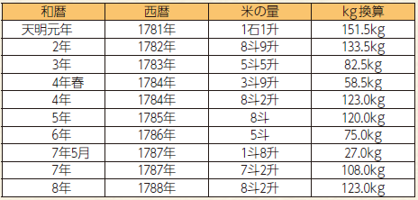 これによると、飢饉が始まる前の天明元年には金1両で買える米の量は1石1升(1石は約150kg)だったのが、2年には8斗9升、3年には5斗5升、4年の春には3斗9升まで値上がりします。もちろん米だけでなく、麦、粟、稗、他の雑穀もすべて高値です。それでも天明4年冬には8斗2升になりましたが、5年は8斗、6年は5斗でした。