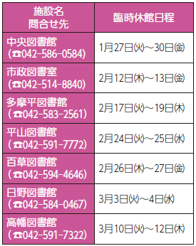 ■市立図書館は蔵書点検のため、右記の日程で臨時休館します。