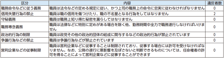 (1)職員は全体の奉仕者として公共の利益のために勤務し、職務の遂行に当たり全力で専念しなければなりません。職員が守るべき義務は次の通りです(令和6年度) (単位:人)