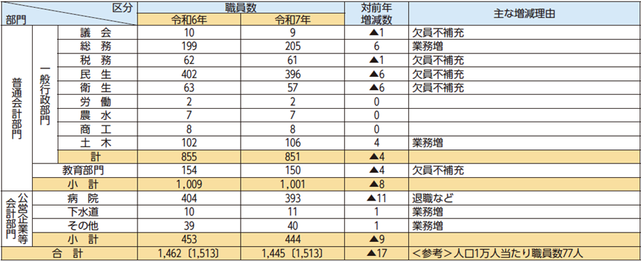 (1)部門別職員数の状況と主な増減理由(令和7年4月1日現在) (単位:人)