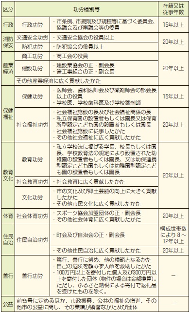 市民または市に関係のある個人・団体で、公共の福祉の増進、市民文化の向上に尽力され、その業績が顕著なかたを表彰します。下表の表彰基準を参照し、該当するかたを推薦してください。ただし、自己、自己の配偶者および3親等内の親族は推薦できません。