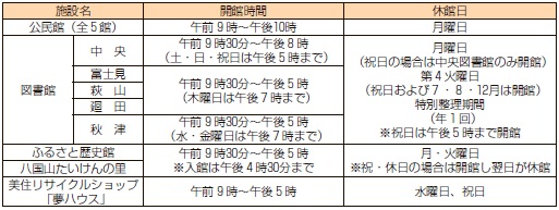 くらし 施設開館時間 29/30 前の記事 次の記事 発行日 : 2025年12月01日 自治体名 : 東京都東村山市 広報紙名 : 市報ひがしむらやま 令和7年(2025年)12月1日号 ■施設開館時間(臨時休館、年末年始等は別途お知らせします) ※表に記載がない施設は、各施設にお問い合わせください。 Tweet シェアする イベント~まつり・集い その他のお知らせ(市報ひがしむらやま 令和7年(2025年)12月1日号)