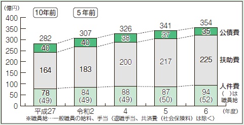 令和6年度は令和5年度比で、公債費が2億4千509万6千円減となった一方で、扶助費が9億3千万7千円増、人件費が6億6千389万9千円増となり、義務的経費全体で13億4千881万円の増となりました。