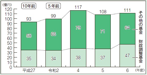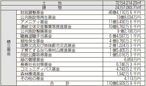 市有財産には、土地や建物のほかに、目的ごとに積み立てている基金があります。基金には年度間の財源調整や災害等に備えるための財政調整基金、公共施設の整備のための財源を準備する公共施設整備基金等があります。財政調整基金の令和6年度末残高は、令和5年度末より9億9千699万2千円増の46億4千110万6千円となりました。
