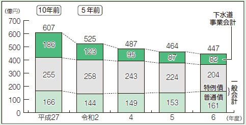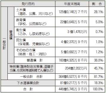 内訳は、一般会計については、普通債(公共施設等の整備のために発行した市債)が7億5千171万4千円増となった一方で、特例債(公共施設等の整備以外のために発行した臨時財政対策債等)が20億203万2千円減となったことにより、全体で12億5千31万8千円減となりました。