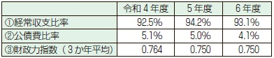 経常収支比率・公債費比率・財政力指数の3つの財政指標の推移です。