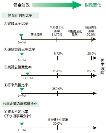 市は、「地方公共団体の財政の健全化に関する法律(財政健全化法)」によって財政健全化にかかる指標(健全化判断比率、資金不足比率)を市の監査委員の監査に付したうえで議会に報告し、市民の皆さんに公表することが義務付けられています。