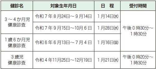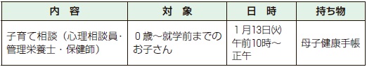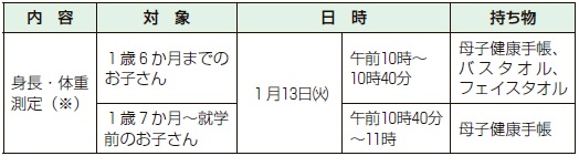 申込み:1月8日(木)までに電話又は直接母子保健課(いきいきプラザ3階)へ