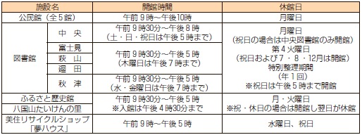 くらし 施設開館時間 36/37 前の記事 次の記事 発行日 : 2026年01月01日 自治体名 : 東京都東村山市 広報紙名 : 市報ひがしむらやま 令和8年(2026年)1月1日号 ■施設開館時間(臨時休館、年末年始等は別途お知らせします) ※表に記載がない施設は、各施設にお問い合わせください。 Tweet シェアする 第33期東村山市スポーツ推進委員の募集 その他のお知らせ(市報ひがしむらやま 令和8年(2026年)1月1日号)