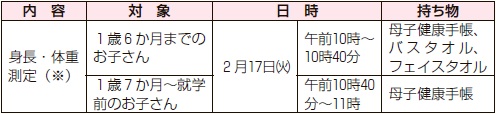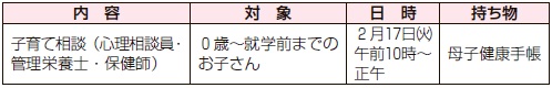 申込み:2月13日(金)までに電話又は直接母子保健課(いきいきプラザ3階)へ