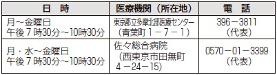 ・救急車を呼ぶか、病院へ行くか、どこの病院へ行けばよいか分からないときは東京消防庁救急相談センター(【電話】#7119)、つながらないときは(【電話】042-521-2323)へ