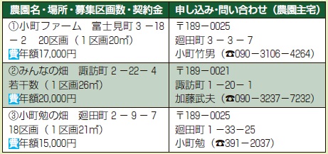 2月21日(必着)までに、往復はがきに氏名・年齢・住所・電話番号・農園名を明記し、各農園主宅(下表参照)へ