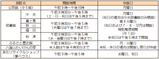 くらし 施設開館時間 30/34 前の記事 次の記事 発行日 : 2025年04月01日 自治体名 : 東京都東村山市 広報紙名 : 市報ひがしむらやま 令和7年(2025年)4月1日号 ■施設開館時間(臨時休館、年末年始等は別途お知らせします) ※表に記載がない施設は、各施設にお問い合わせください。 Tweet シェアする 母乳相談、BCG予防接種、乳幼児子育て相談、乳幼児の計測 など 春の全国交通安全運動(4月6日~15日)