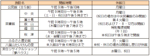 くらし 施設開館時間 28/30 前の記事 次の記事 発行日 : 2025年05月15日 自治体名 : 東京都東村山市 広報紙名 : 市報ひがしむらやま 令和7年(2025年)5月15日号 ■施設開館時間(臨時休館、年末年始等は別途お知らせします) ※表に記載がない施設は、各施設にお問い合わせください。 Tweet シェアする 5月15日(木)から廃食用油の回収拠点を市内公共施設7か所に増設します! 人口と世帯(令和7年5月1日現在)