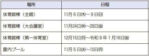 設備点検や改修工事、産業まつり開催のため、下表のとおりTAC東村山スポーツセンター体育館棟(全館又は一部)および屋内プールの一般利用を休止します。