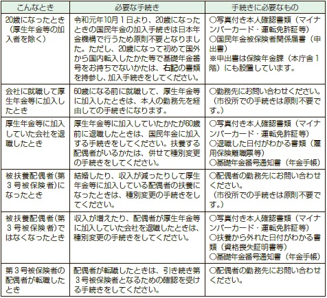 国民年金は日本に住む20〜59歳のすべてのかたが加入しなければなりません。届出は加入するときだけではなく、勤務先を変更したとき等にも必要です(下表参照)。