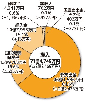国民健康保険税と繰入金は、前年度と同水準だったものの、都支出金は2.2億円の減となりました。繰入金のうち、法定外繰入金は約5.4億円です。