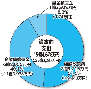 全体の51.5%を占めるのは、建設改良費です。主なものは、ストックマネジメント計画に基づく工事費等です。なお、資本的収支にかかる収入不足額3億380万9,719円は、当年度分損益勘定留保資金等で補てんしました。