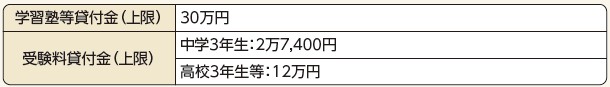 中学3年生・高校3年生など受験生のお子さんを養育している一定所得以下の世帯に、学習塾等の受講料や、高校・大学などの受験料の無利子貸付を行っています(保証人不要)。高校・大学等へ進学した場合、資金使途の確認書類を提出後に、償還免除申請を行うことで返済が免除されます。詳細は、問合せまでお問い合わせください。また、窓口にお越しの際は事前にご連絡ください。