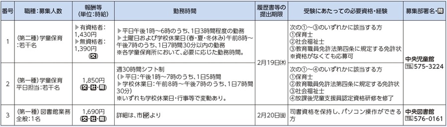 申込み:履歴書(写真貼付・職種記入)と資格が必要な職種は、その資格取得者であることを証明するものの写しを各期限(必着)までに、問合せまで郵送または窓口まで