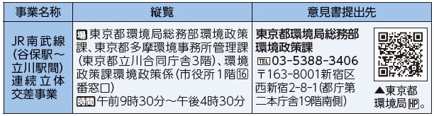 対象の事業名、氏名、住所(法人その他の団体にあっては、名称、代表者の氏名および東京都の区域内にある事務所または事業所の所在地)、環境の保全の見地からの意見を記載のうえ、各表中の意見書提出先へ持参(最終日午後5時まで)、郵送(当日消印有効)または東京都環境局HPの提出フォームより