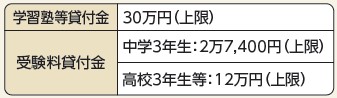 学習塾等の受講費用や、高校・大学などの受験料の無利子貸付を行ってい収入要件ます(保証人不要)。高校・大学等へ進学した場合、資金使途の確認書類を提出後に、償還免除申請を行うことで返済が免除されます。詳細は、問合せまでお問い合わせください。窓口へお越しの際は、事前にご連絡ください。