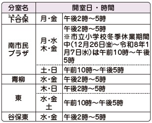 ※南・下谷保は令和8年1月5日(月)、東・青柳・谷保東は1月7日(水)から開室します。