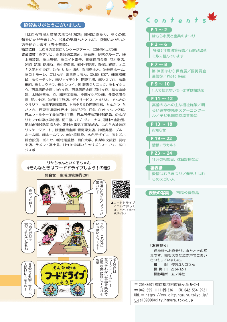 くらし 広報はむら 2025年11月1日号 P.01 2/26 前の記事 次の記事 発行日 : 2025年11月01日 自治体名 : 東京都羽村市 広報紙名 : 広報はむら 2025年11月1日号 Tweet シェアする 広報はむら 2025年11月1日号 表紙 広報はむら 2025年11月1日号 P.02