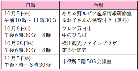 申込み方法:電話、メール、電子申請のいずれかの方法で申し込んください。メールでの申込みの場合、名前、年齢、住所、電話番号、連絡用メールアドレス、参加希望日・会場をご記入の上、お送りください。