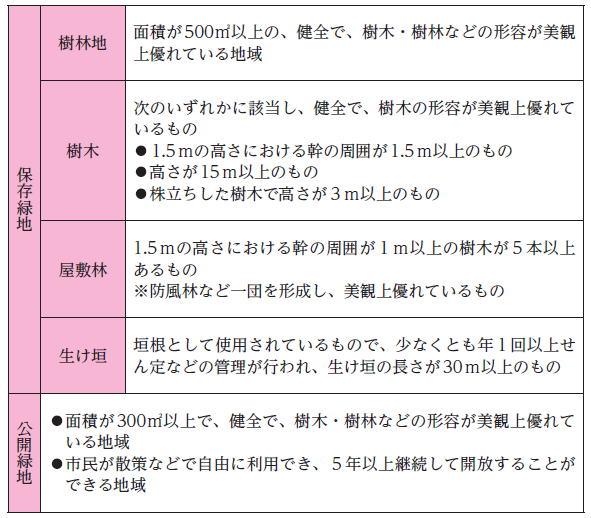 市では、緑地を保全し、緑化を推進するため、保存緑地と公開緑地の指定制度を設けています。表の指定条件を満たし、「適切な管理のもと大事にしている」「先祖代々受け継いで大切にしている」など、長期的な保存や公開にふさわしい緑地をお持ちの方で、指定を希望する方は、お問い合わせください。指定は、市長が必要と認め、所有者などの同意を得た後に、緑地保全審議会に意見を求め決定します。保存緑地は、指定後、樹木の枯死を防ぐための管理経費など、保存に関する費用の一部を予算の範囲内で補助します。
