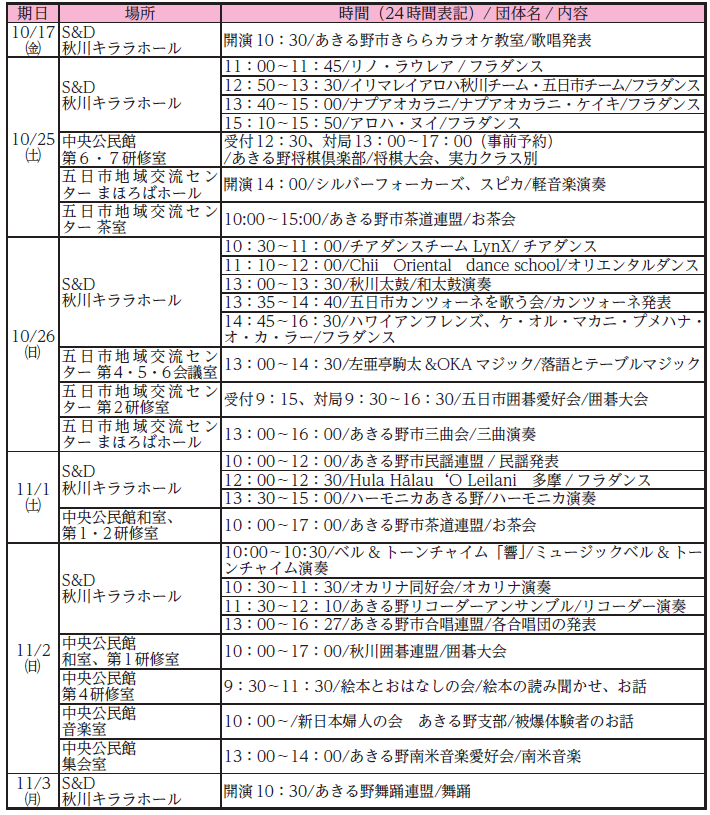 ・秋川体育館・中央公民館…11月1日(土)・2日(日)午前10時~午後4時(2日は午後3時30分まで)