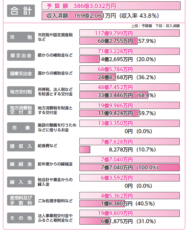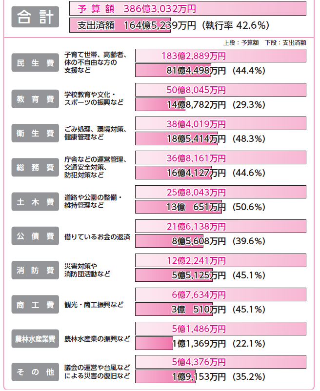 9月30日現在の一般会計予算は、当初予算後に2回の補正を行い、前年度からの繰越明許費2億9,462万円を含めて、予算総額は、386億3,032万円となっています。