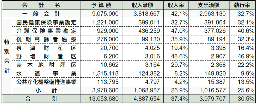 一般会計は、前年同期の収入率39.3%、執行率33.2%と比較すると、収入では2.8%の増、支出では0.5%の減です。なお、国民健康保険事業勘定は、現段階における試算において6千万円程度の単年度赤字を見込んでおり、年度末に額が確定した後、一般会計より補てんする予定です。