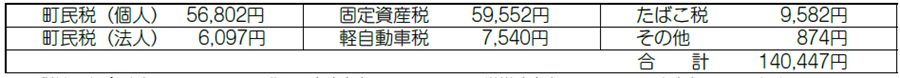 町税は一般会計歳入の10.2%で、住民1人当たり14万447円、1世帯当たり22万2435円を負担しています。